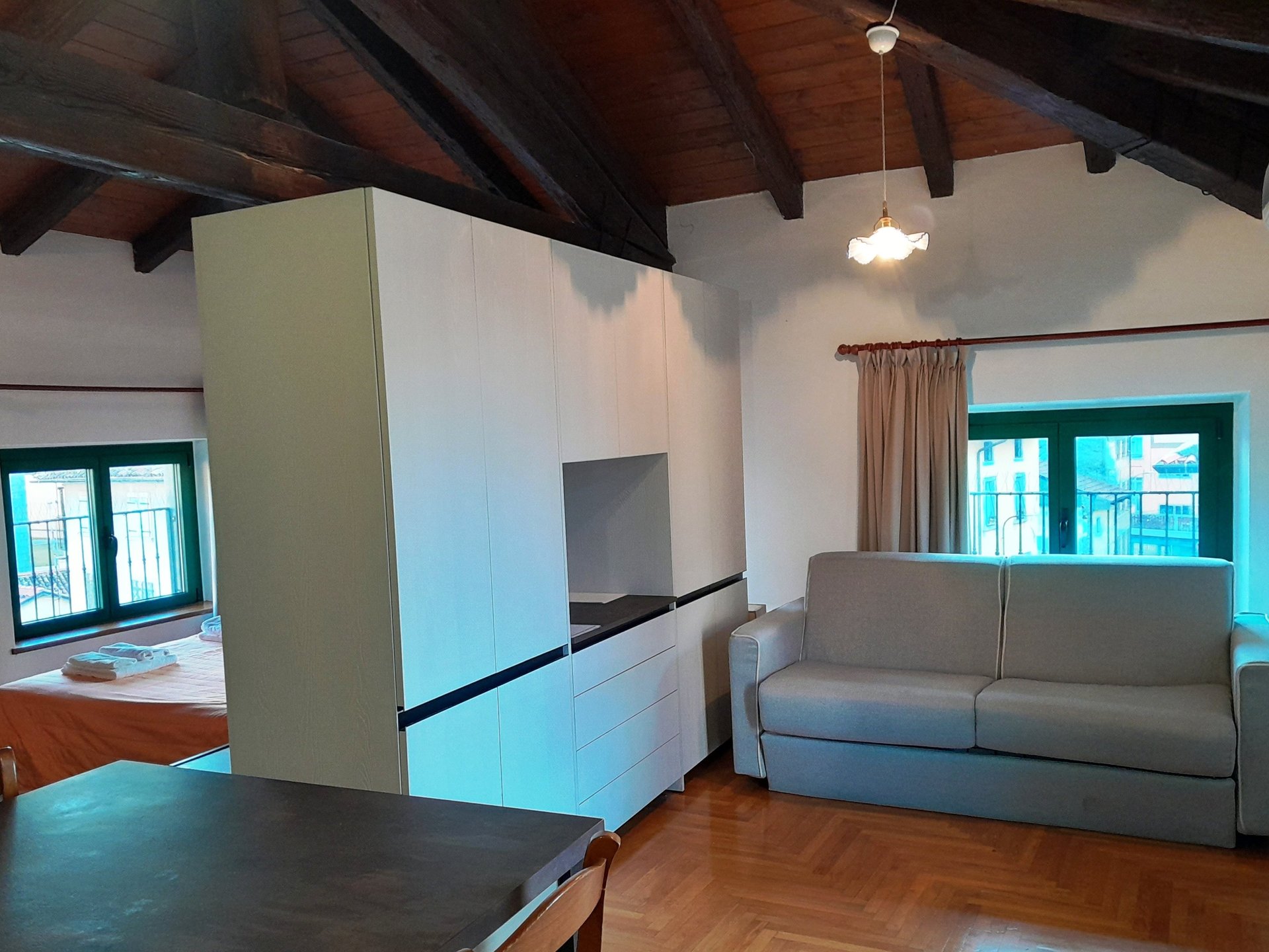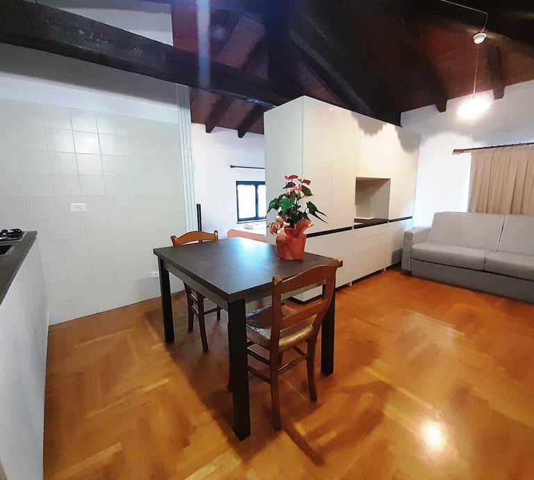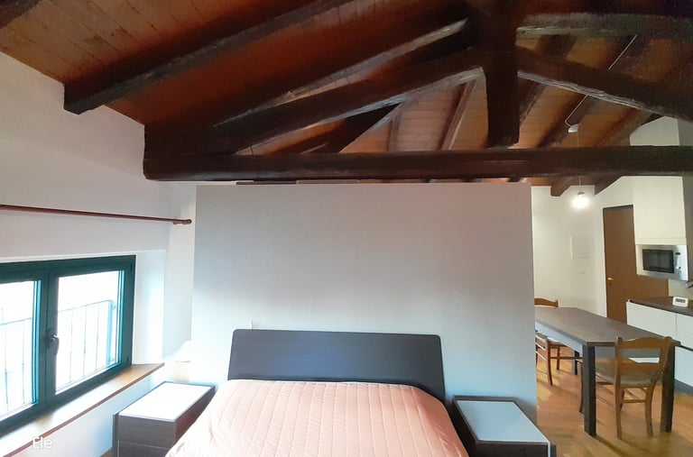 Ampio e luminoso loft con travi a vista, composto da letto matrimoniale, divano letto matrimoniale separato da un mobile arredo centrale, cucina attrezzata con tavolo, bagno interno completo finestrato e terrazza esclusiva di 70 mq. Dotato di: tv, wi fi free, aria condizionata, riscaldamento.