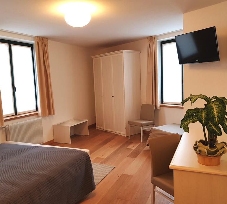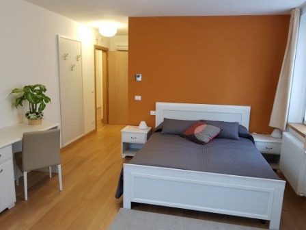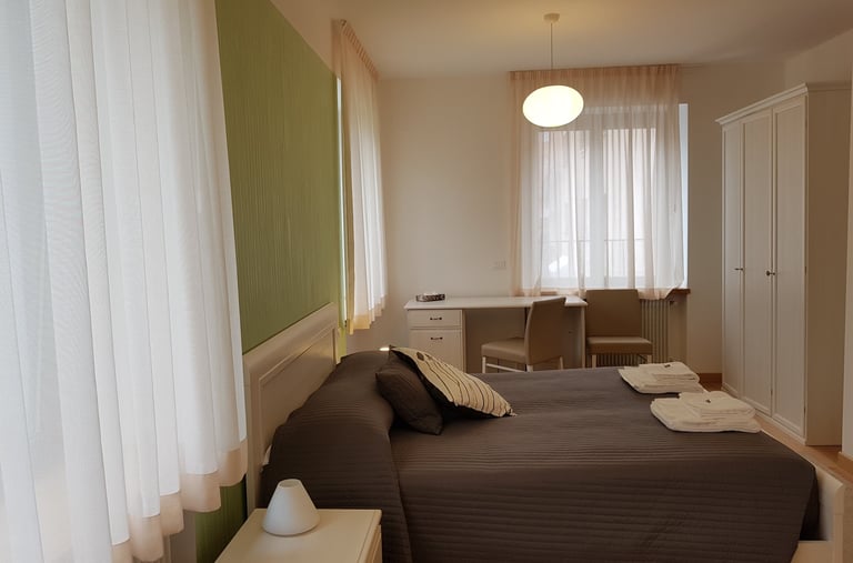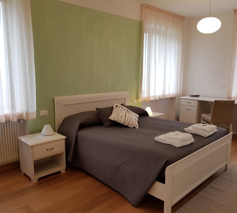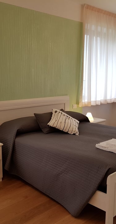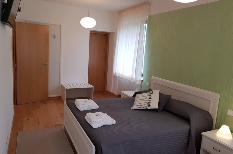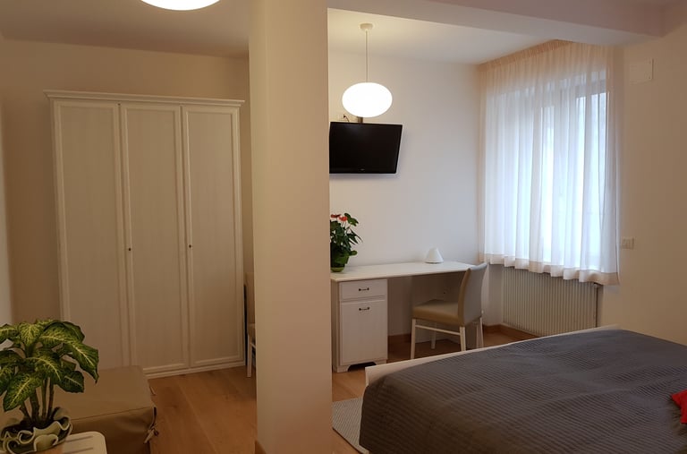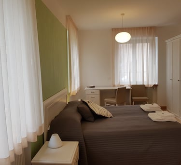 Ampia e luminosa camera matrimoniale con terzo letto aggiunto a parte, con bagno interno completo, dotata di tv, wi fi free, aria condizionata, riscaldamento, scrivania, guardaroba, minifrigo e bollitore.